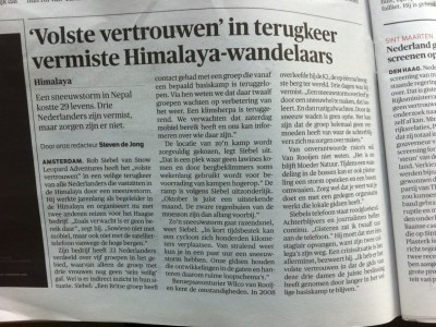 Rob Siebel van Snow Leopard Adventures heeft het „volste vertrouwen” in een veilige terugkeer van alle Nederlanders die vastzitten in de Himalaya door een sneeuwstorm. Hij werkte jarenlang als begeleider in de Himalaya en organiseert nu met twee anderen reizen voor het Haagse bedrijf. „Zoals verwacht is er geen bereik daar”, zegt hij. „Sowieso niet met mobiel, maar ook niet met de satelliettelefoon vanwege de hoge bergen.”Zijn bedrijf heeft 33 Nederlanders verdeeld over vijf groepen in het gebied, waarvan alleen de groep met drie vrouwen nog geen ‘sein veilig’ gaf. Wel is er indirect inzicht in hun situatie. Siebel: „Een Britse groep heeft contact gehad met een groep die vanaf een bepaald basiskamp is teruggelopen. Via hen weten we dat daar twaalf groepen wachten op verbetering van het weer. Een klimsherpa is teruggerend. We verwachten dat hij zaterdag mobiel bereik heeft en ons kan informeren over wie daar zijn.”